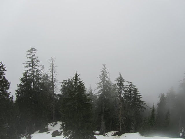 Soon the trail was just winding up and up through a tempest of wind that ripped my hat off my head. Nothing could be seen beyond about 50 feet, and it seemed to be getting worse instead of breaking up. Yes, thank you Washington weather forecasters. Nicest day of the weekend, huh? Way to go.
